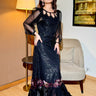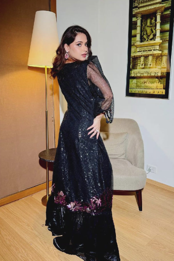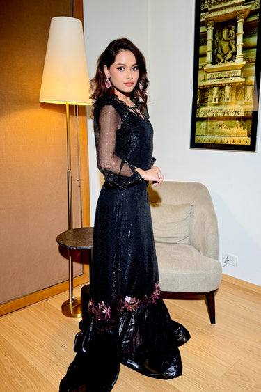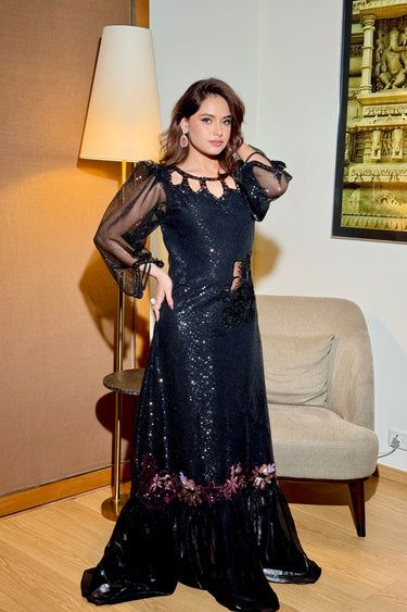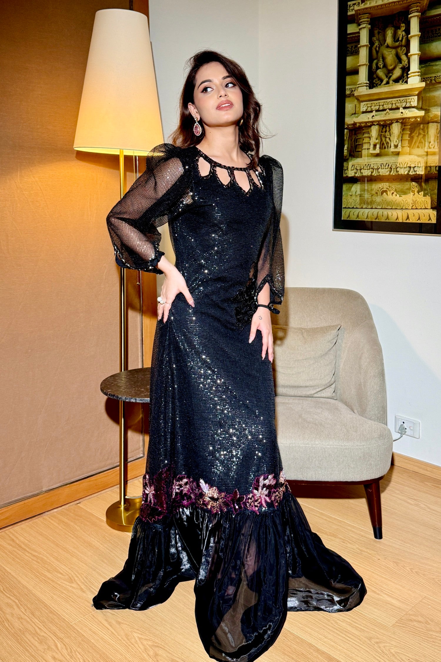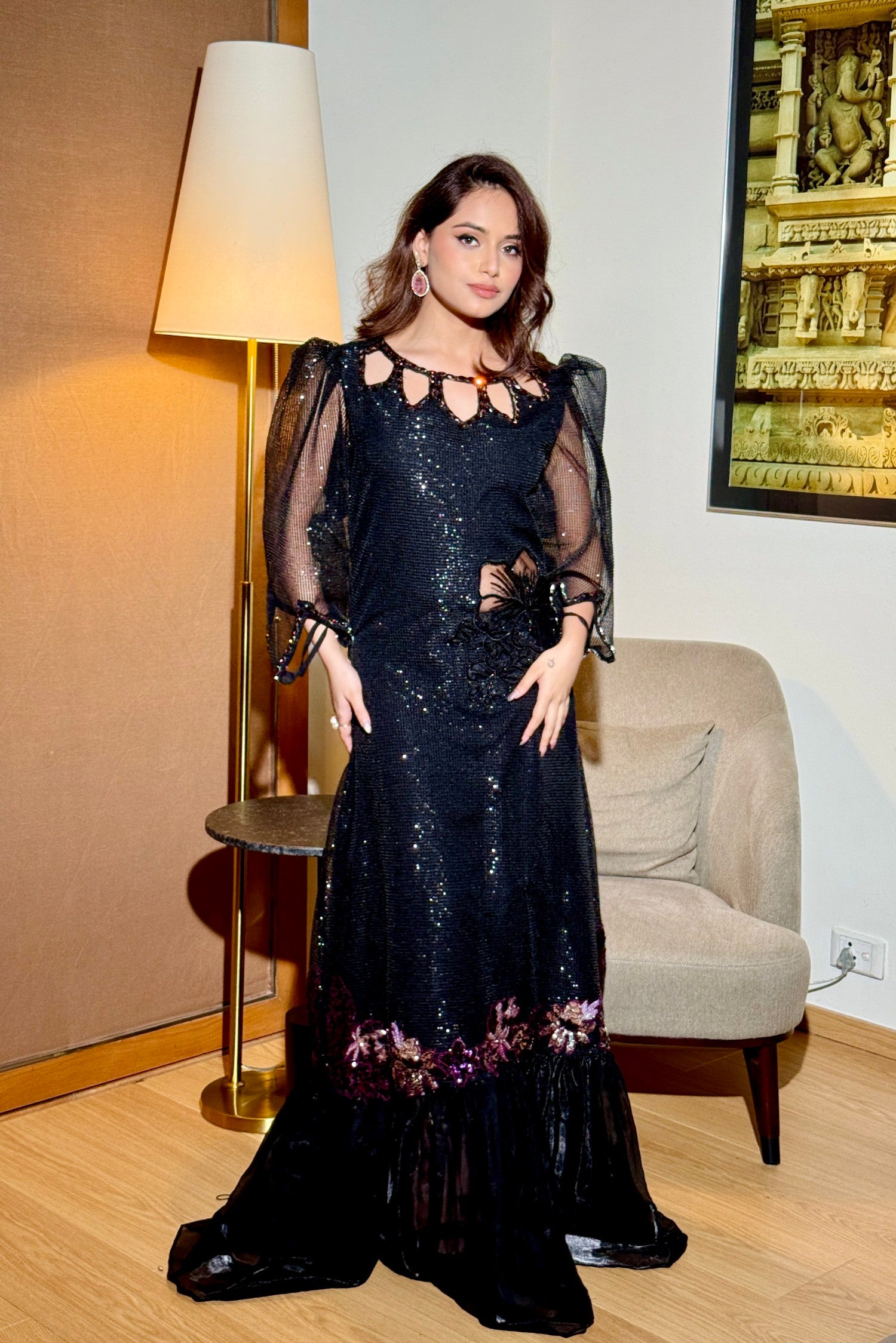 - Full-length sheer sleeves with slight puff at shoulders and stone embroidery on cuffs