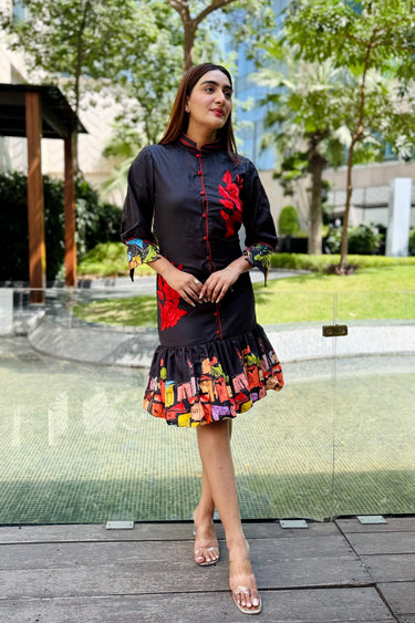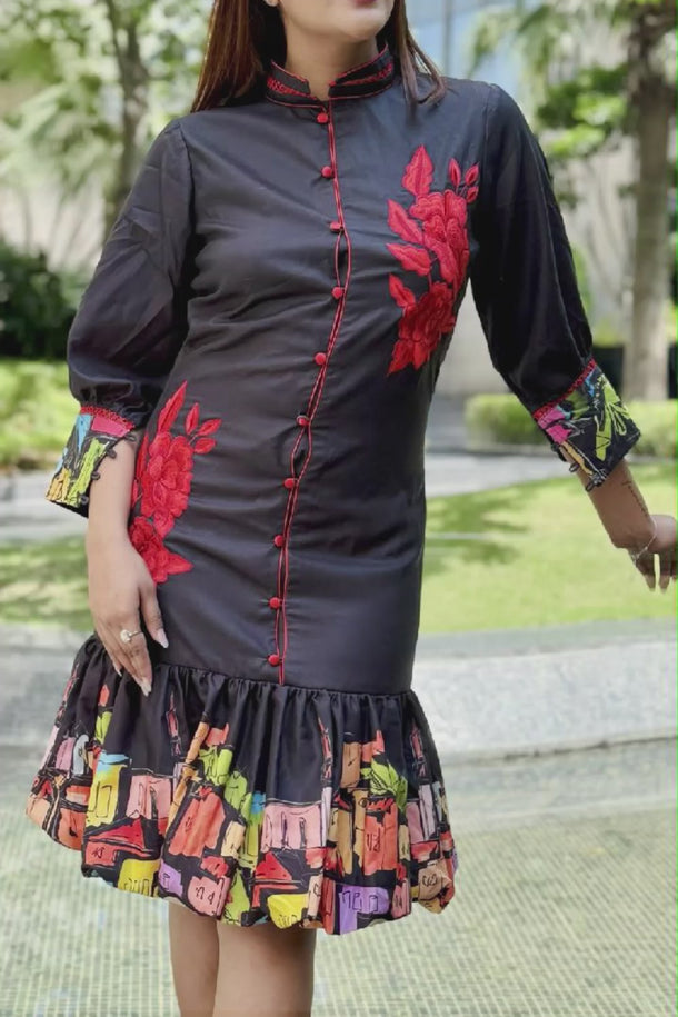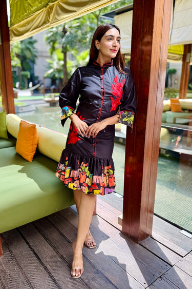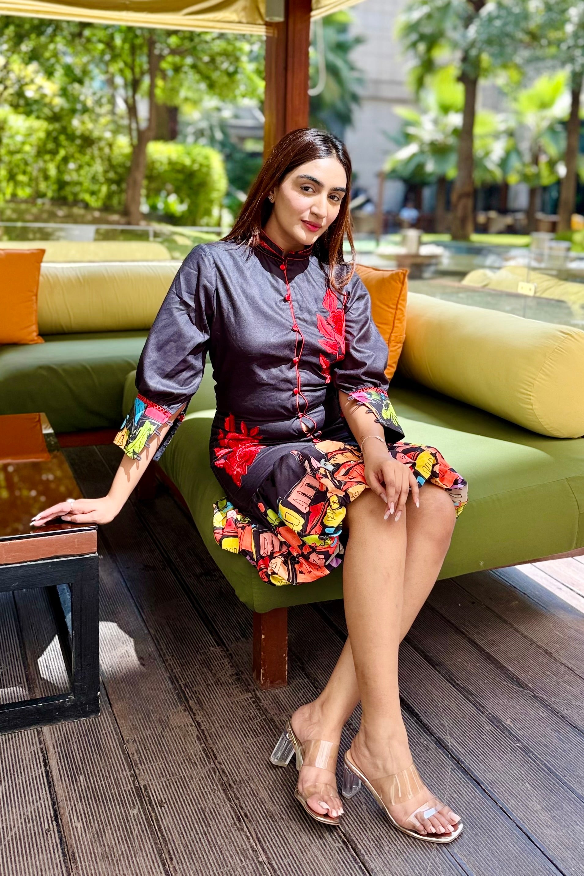 - Hemline featuring multicolor printed panel