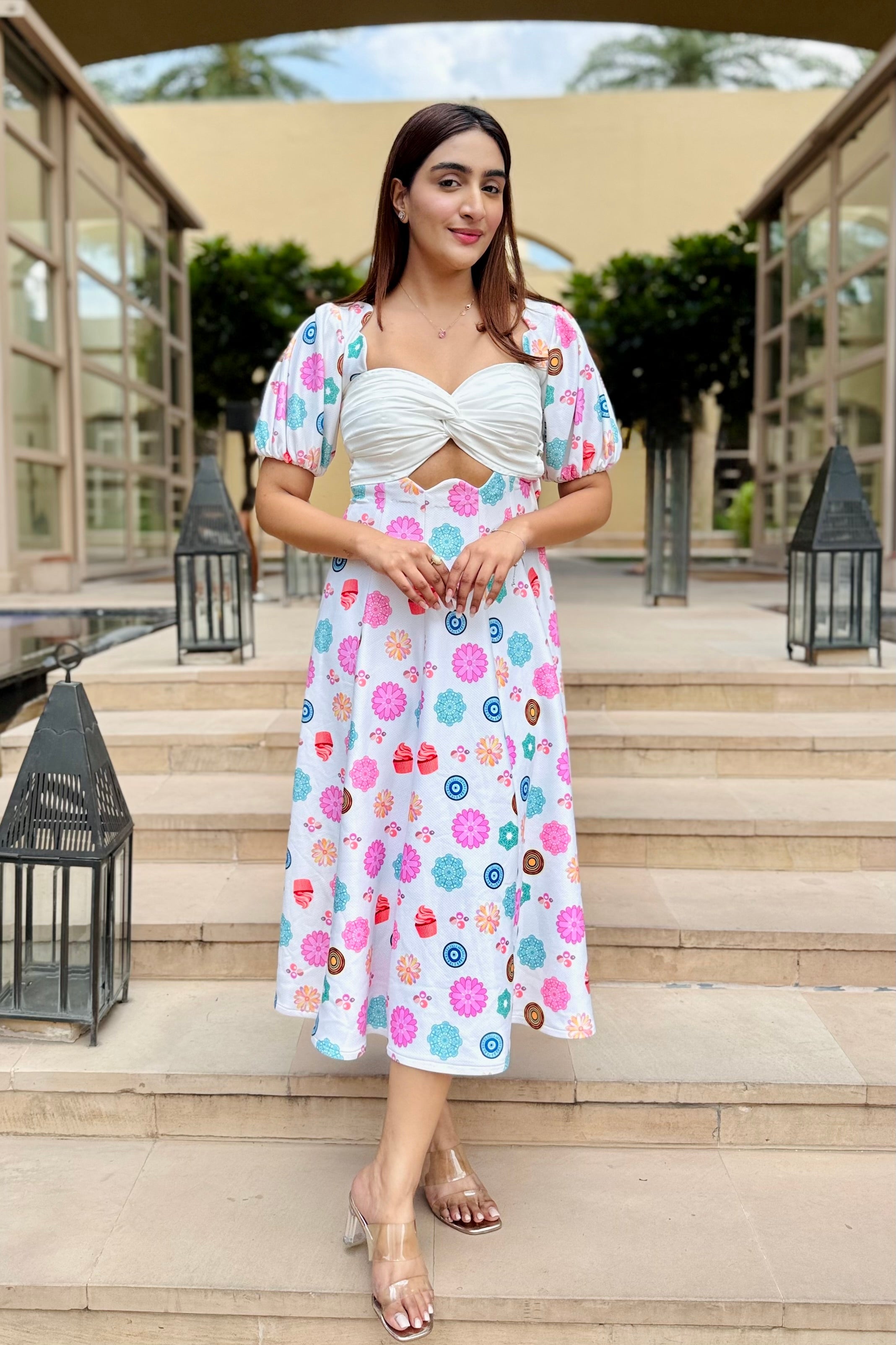 - White base fabric with multicolour floral and motif print